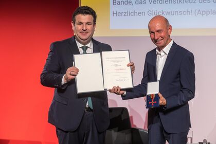 Bundesarbeitminister Hubertus Heil (links) bei der Verleihung des Verdienstkreuzes an Dr. Joachim Stork. Bild: Thomas Rafalzyk