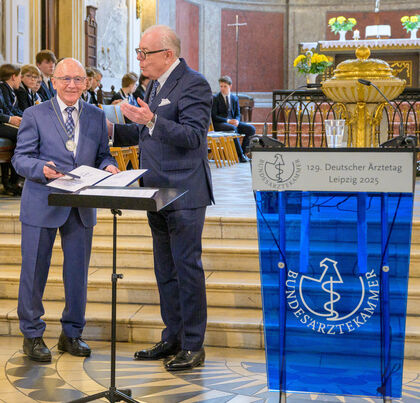 Die deutsche Ärzteschaft hat im Rahmen des 129. Deutschen Ärztetages in Leipzig unseren ehemaligen Präsidenten Professor Dr. med. Klaus Scheuch mit der Paracelsus-Medaille ausgezeichnet. Der Präsident der Bundesärztekammer, Dr. Klaus Reinhardt, würdigte in seiner Laudatio Prof. Scheuch als „einen Arzt und Vordenker, der dazu beigetragen hat, das noch junge Fach der Arbeitsmedizin in wenigen Jahrzehnten zu einem festen Bestandteil des deutschen Gesundheitswesens zu machen.“